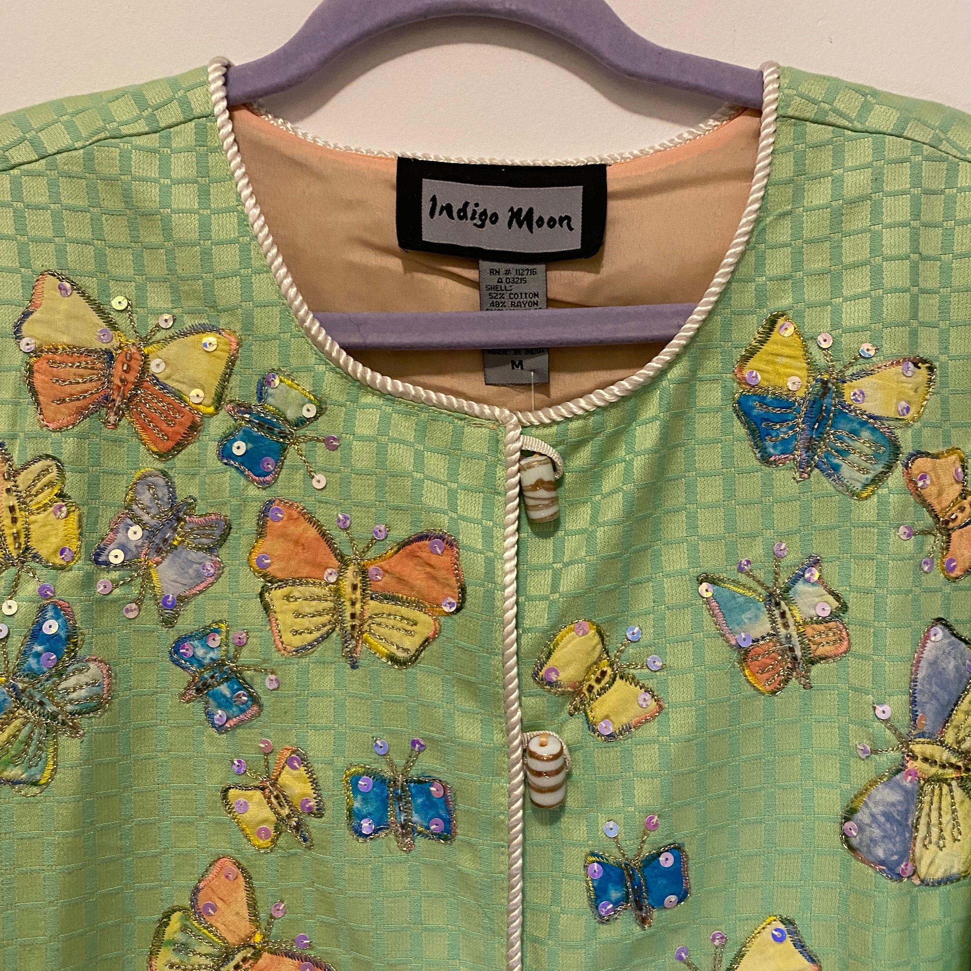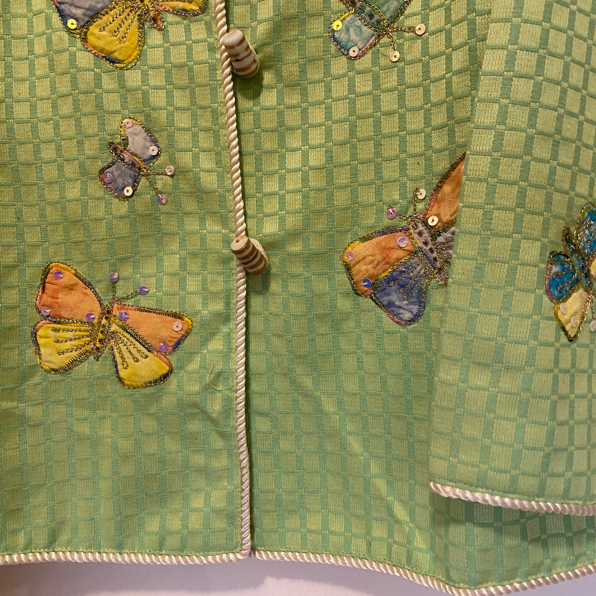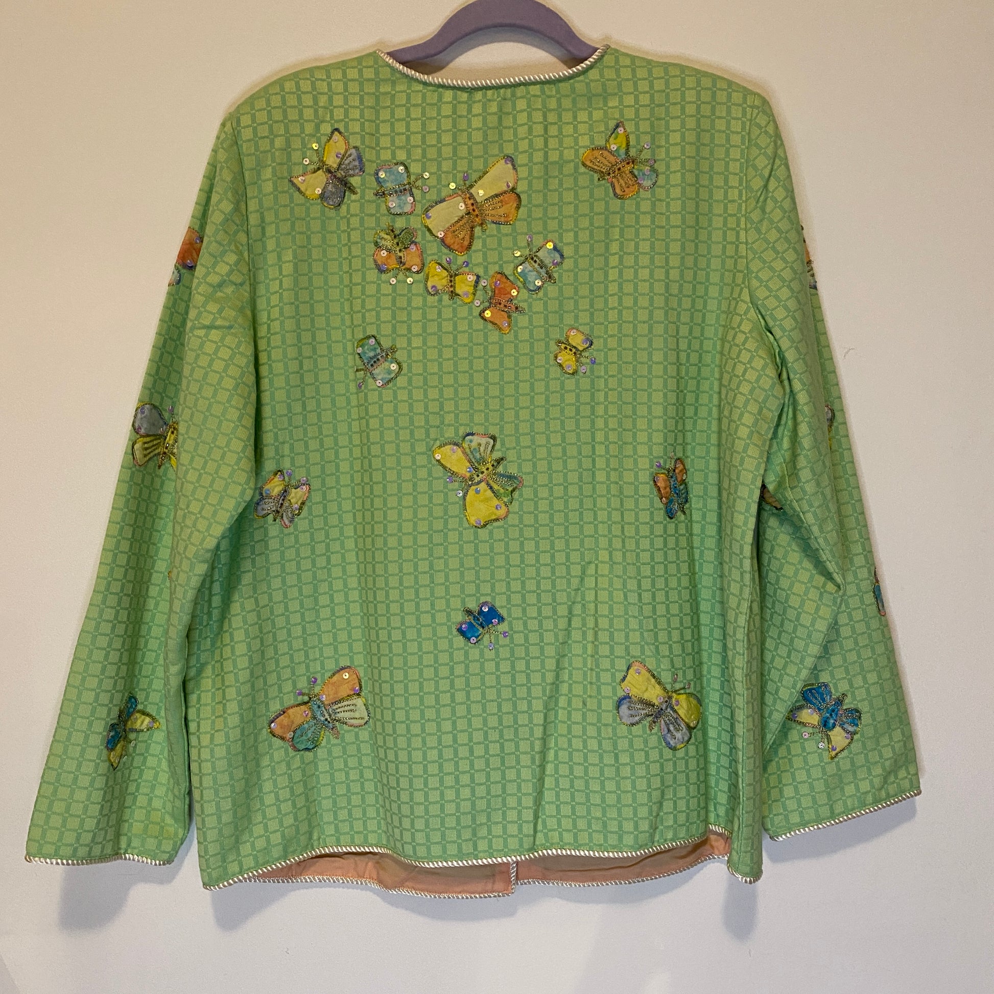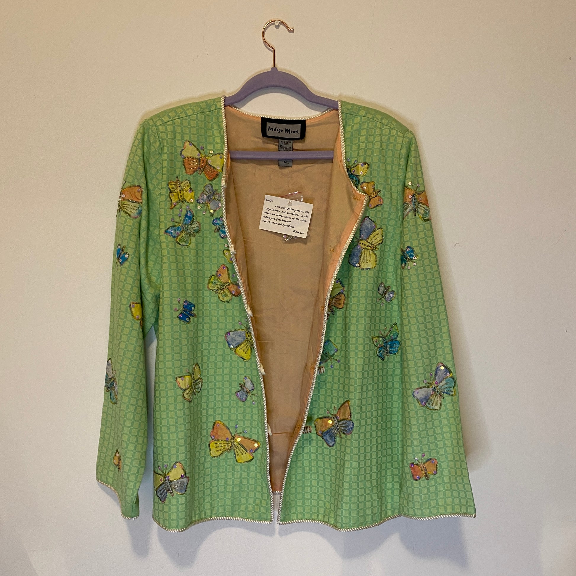 Mint green blazer with sequin butterfly embellishments. Ceramic button closures and pink lining. Never worn, comes with tag attached. Dry clean only.