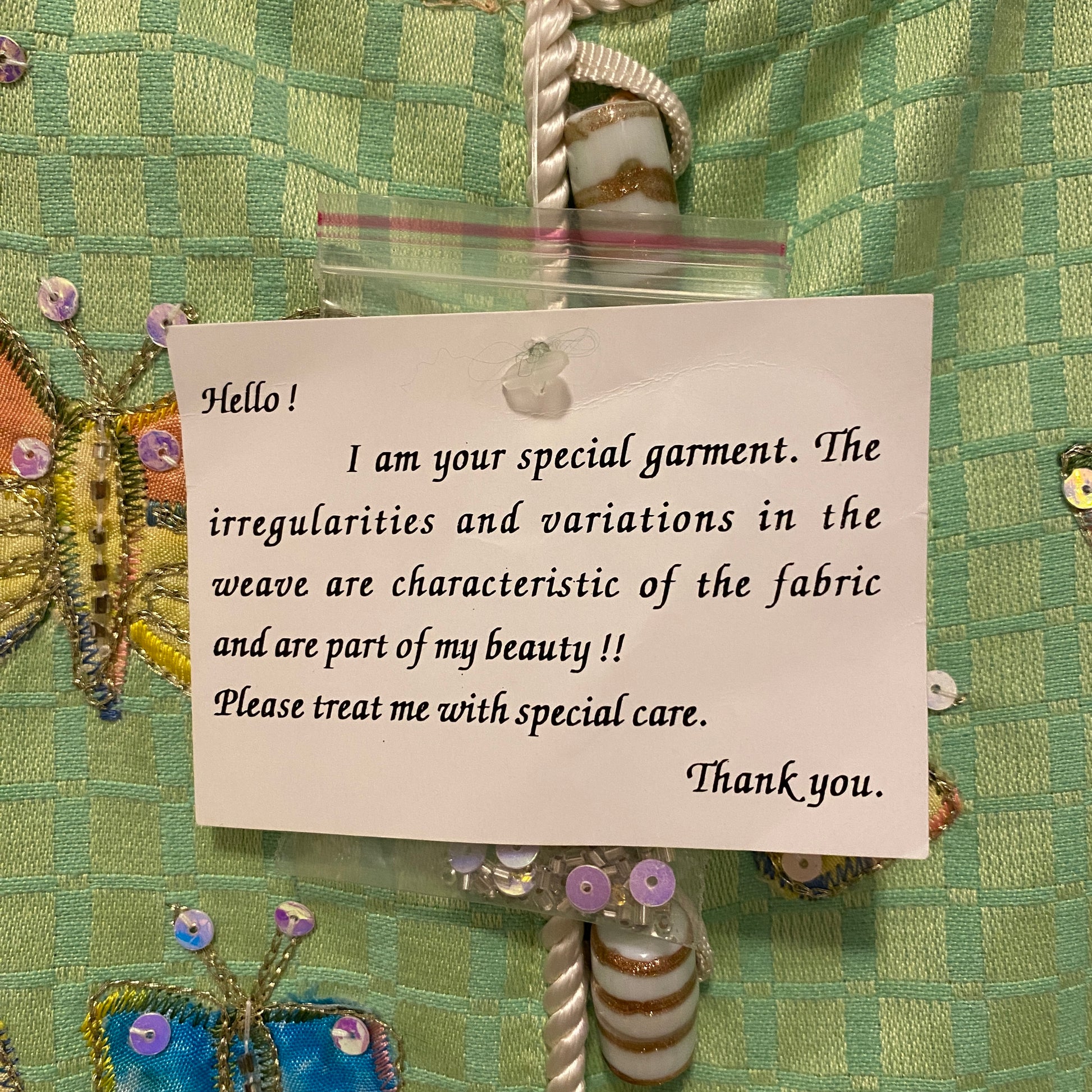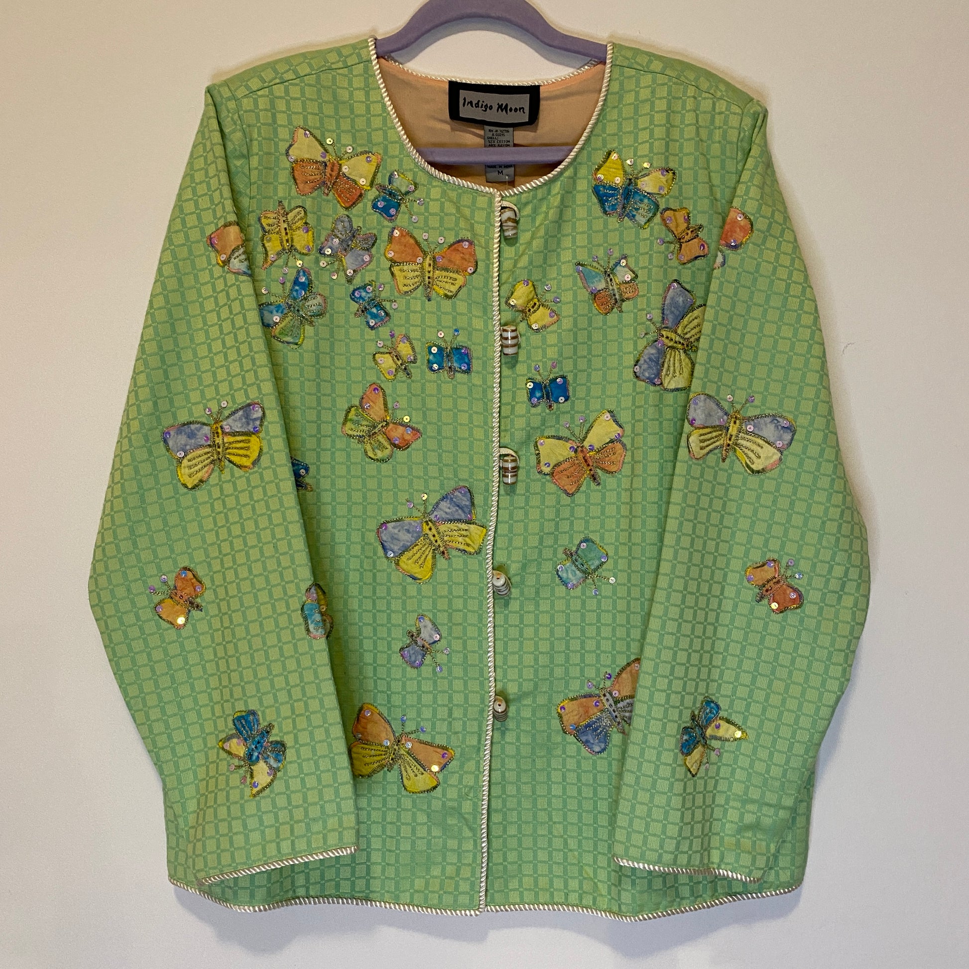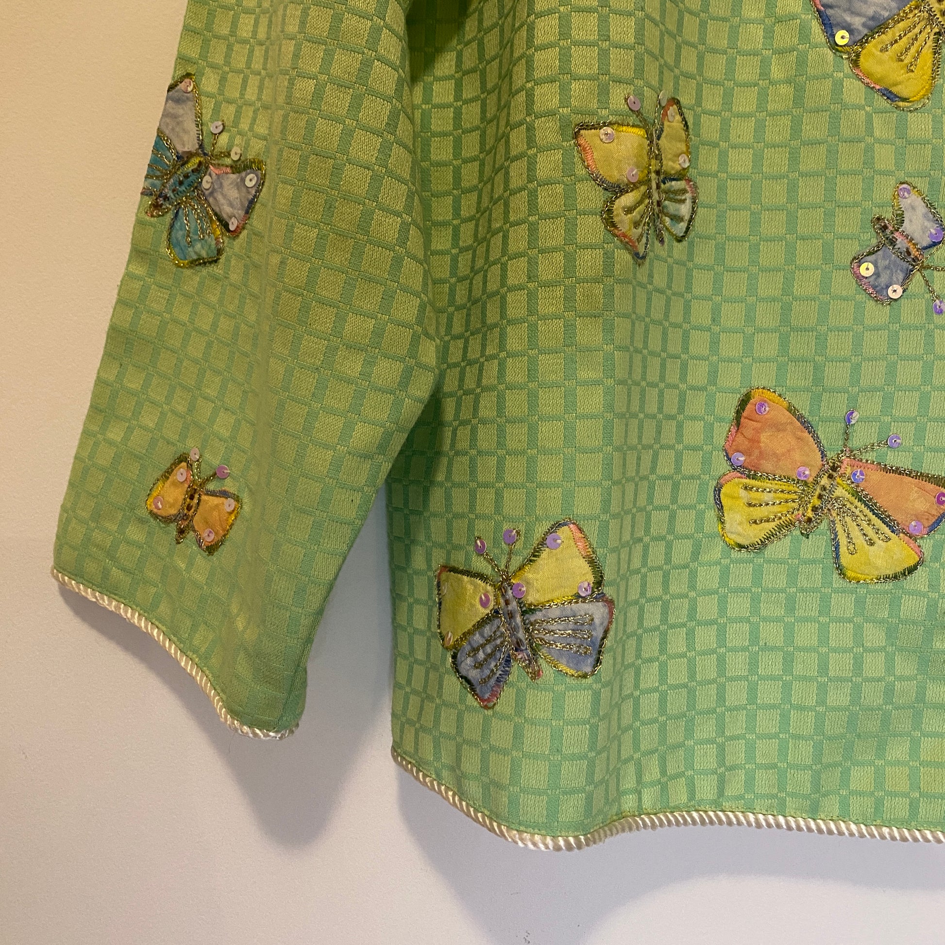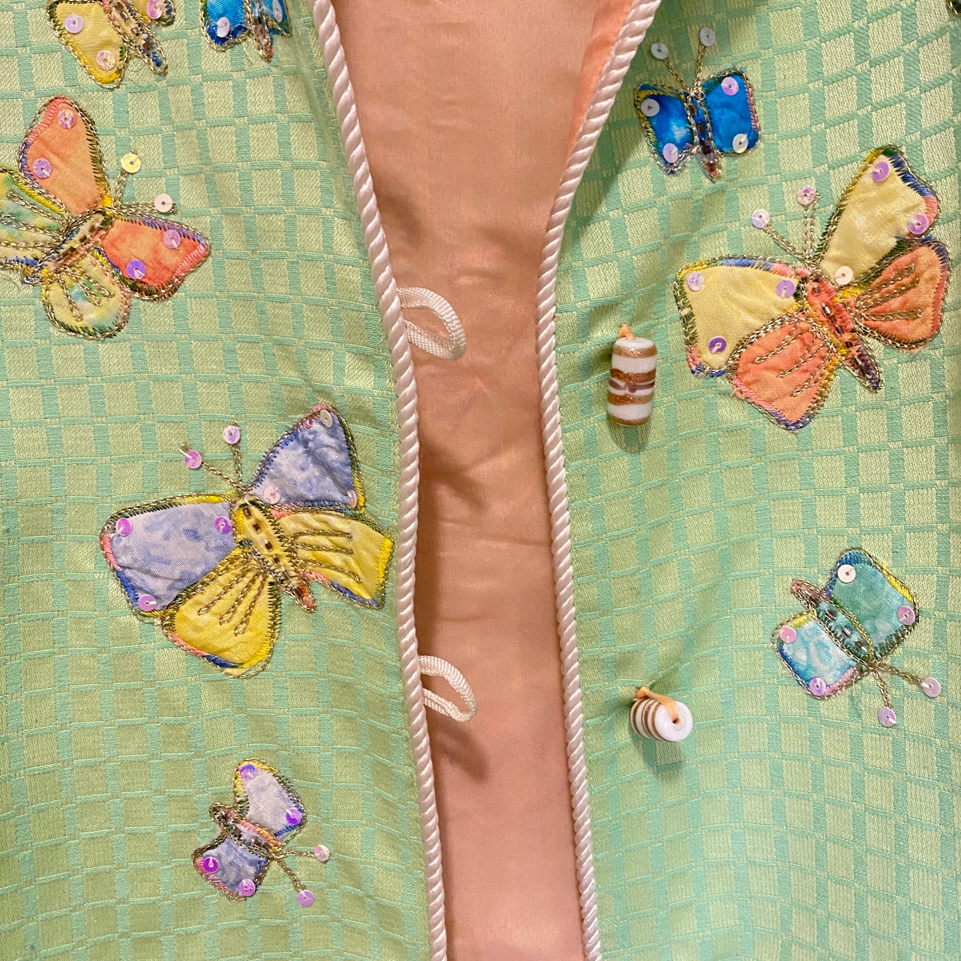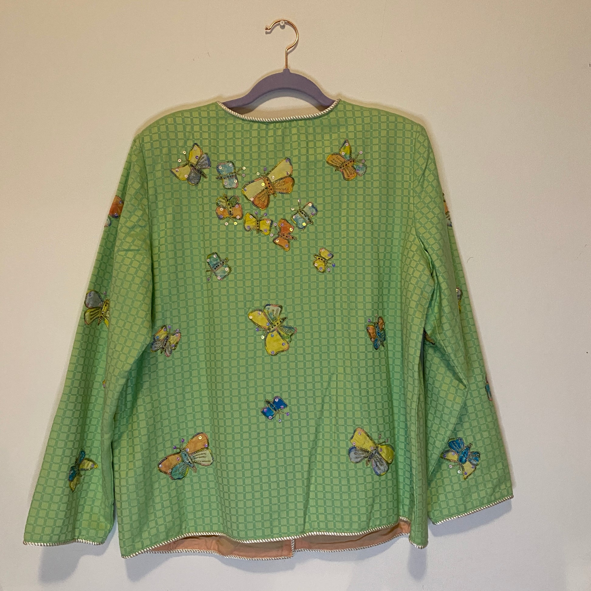 Mint green blazer with sequin butterfly embellishments. Ceramic button closures and pink lining. Never worn, comes with tag attached. Dry clean only.